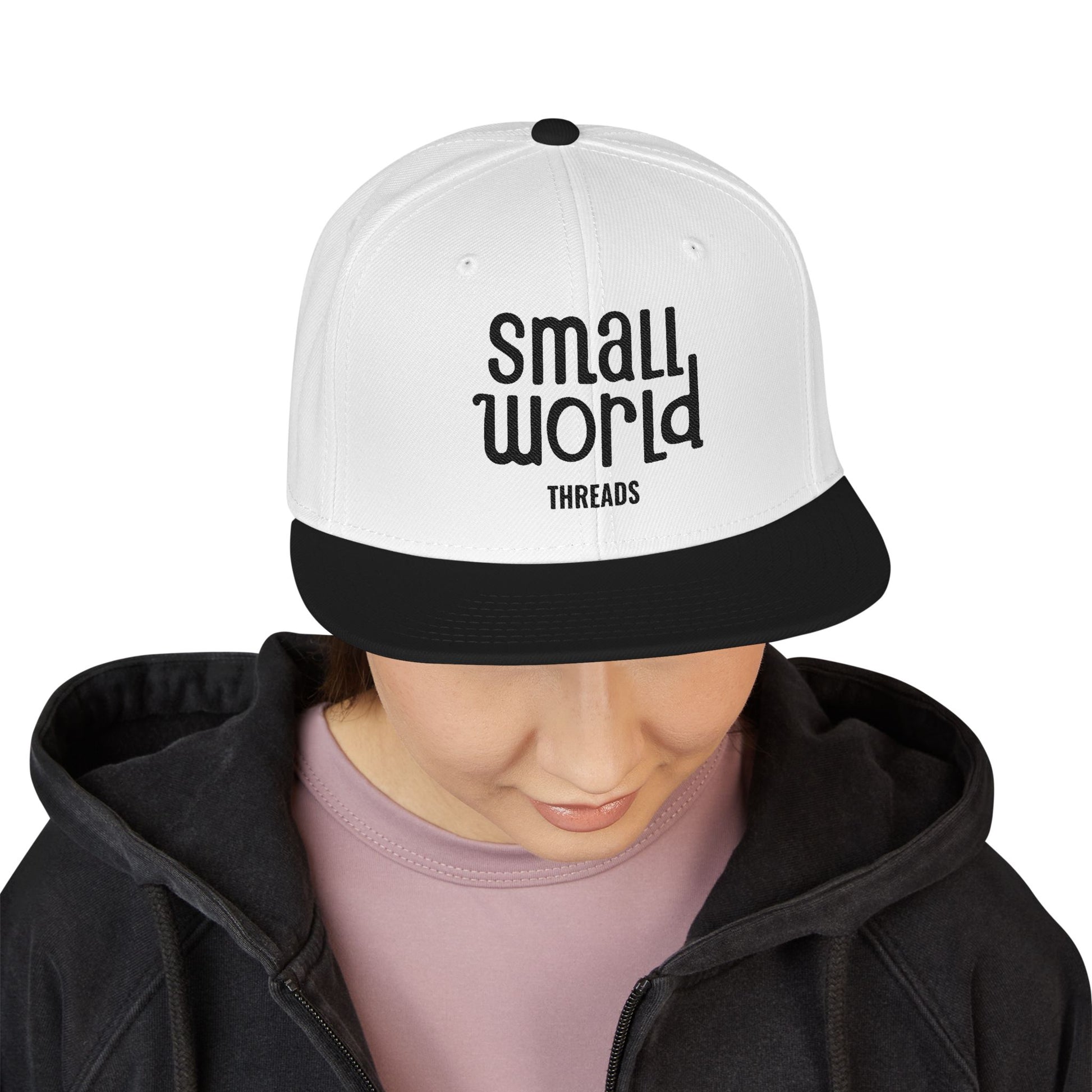 A Snapback cap featuring the Small World Threads logo that exudes a cool and laid-back vibe, perfect for casual everyday wear or adding a stylish touch to an outfit. Ideal for streetwear enthusiasts and those looking for a trendy accessory. Great for gifting on birthdays, holidays, or special occasions.