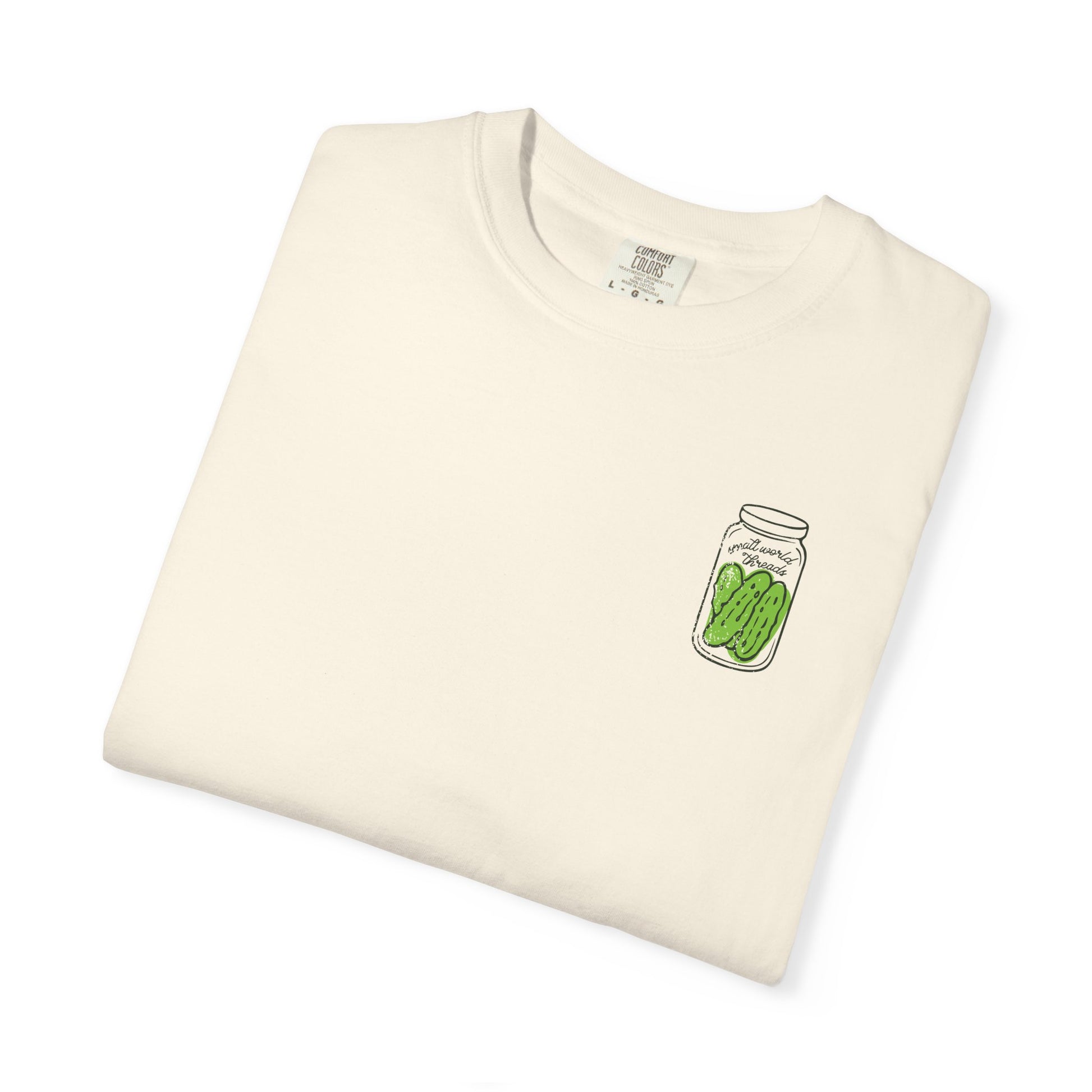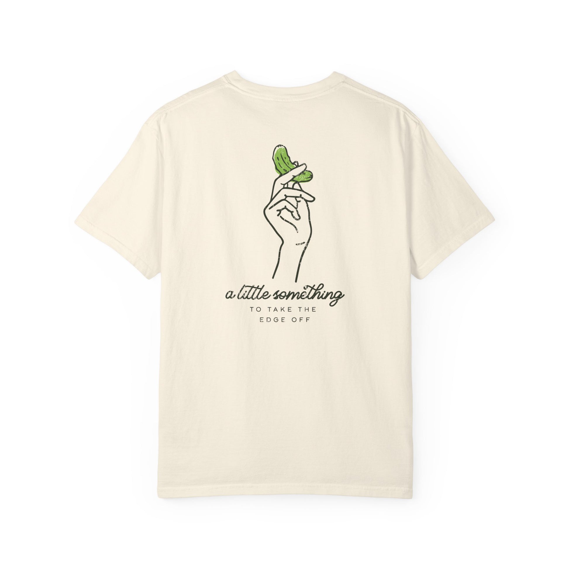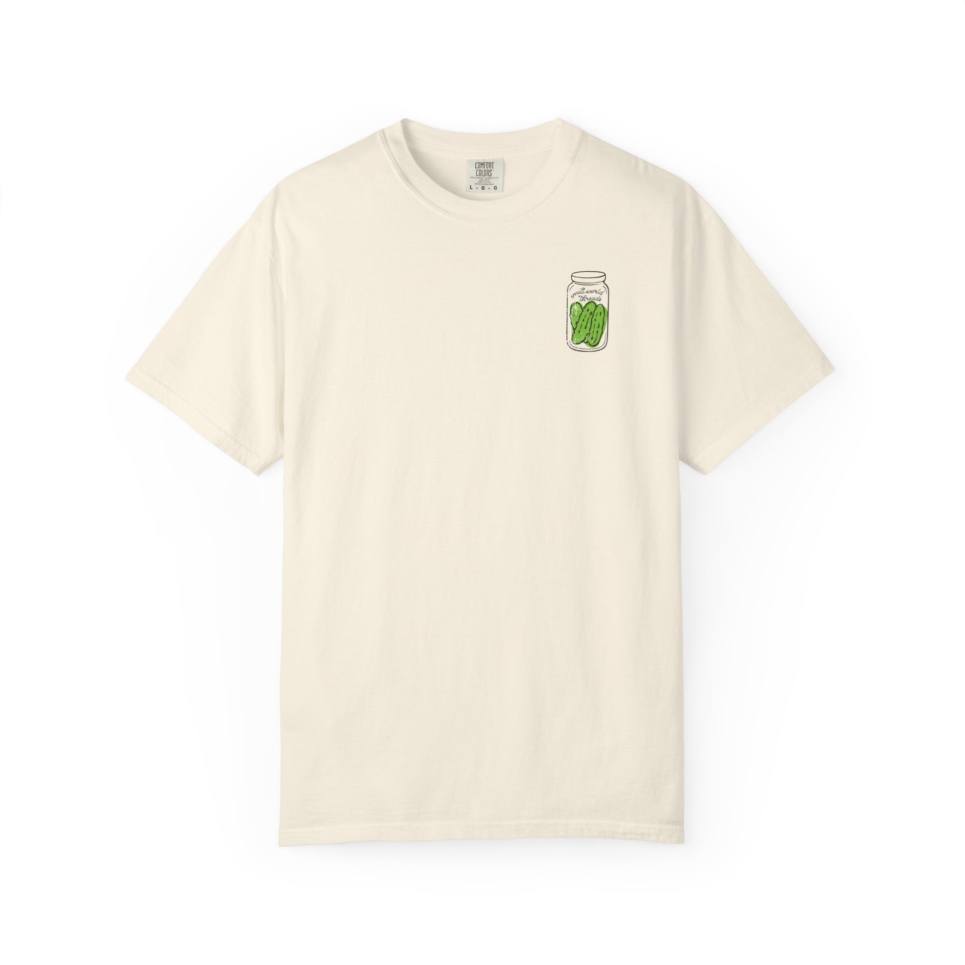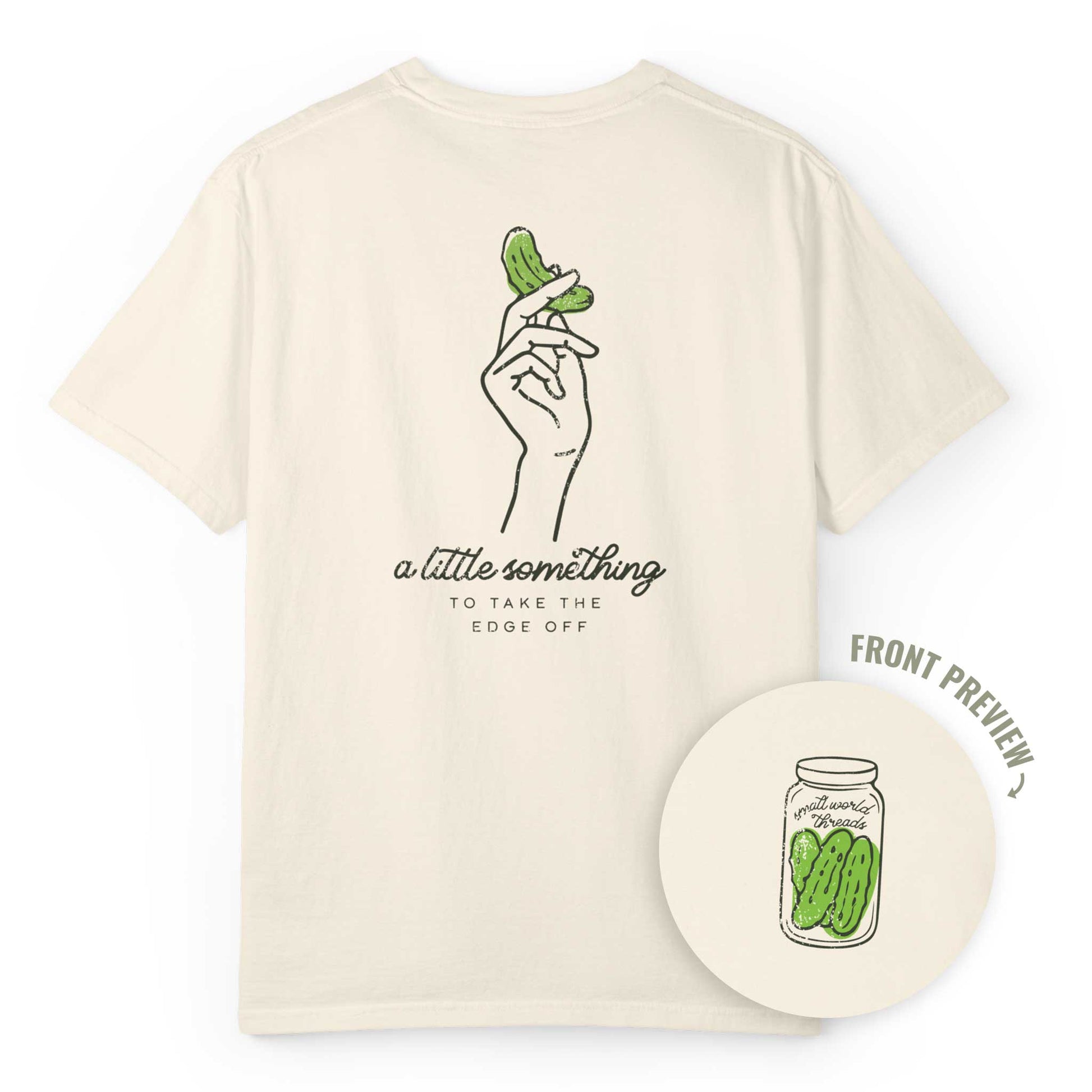 Soft, garment-dyed cotton with a calm, botanical vibe. This relaxed-fit tee features a small jar of pickles on the chest and a delicate line-drawn hand holding a pickle on the back, paired with the handwritten phrase “a little something.” It feels like a quiet, playful moment — the kind of shirt you reach for when you want comfort with a wink. Wear it on slow mornings at the farmers’ market, casual hangouts, or while tending a windowsill herb garden. The muted, vintage-dyed color and medium-weight fabric drape naturally, breaking in with time and becoming even softer. Subtle sewn-in labeling and double-needle seams mean it looks lived-in and lasts, while the tubular knit keeps the silhouette clean and unfussy.